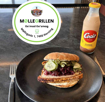Ribben/kamsteg, rødkål og vores gode hjemmelavede agurkesalat. Serveret i en lækker bolle smurt med kokkens hjemmerørte dijon/mayo dressing.
